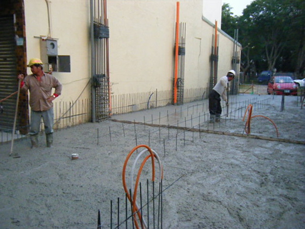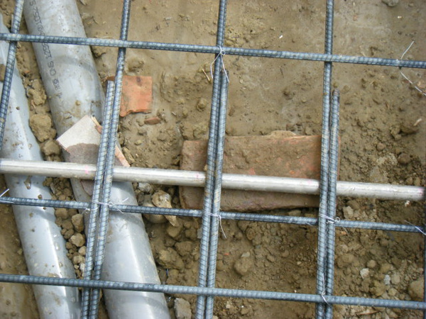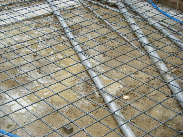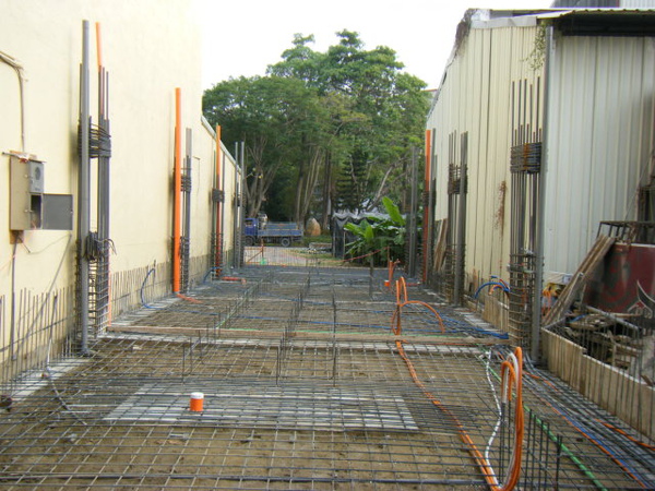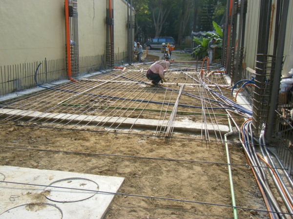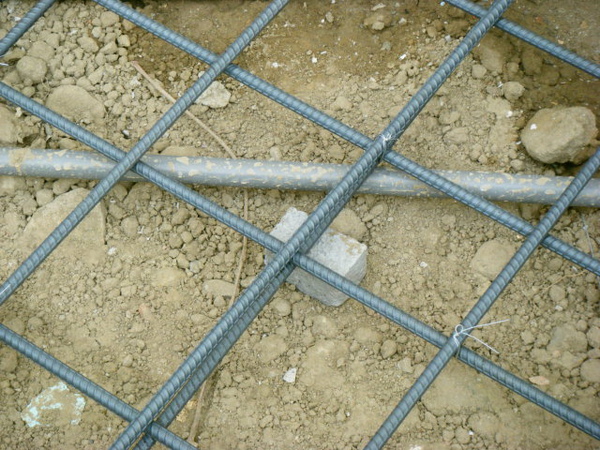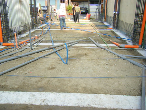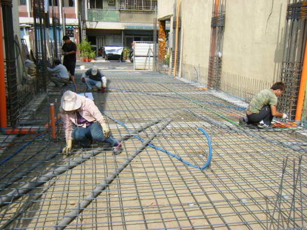 地坪的鋼筋綁在土壤上面,除了注意保護層高度以外,更要注意有沒有鋼筋直接壓在管子上;最好能在管路旁邊補強水泥墊塊,以免施工過程走來走去的壓到管子變形。