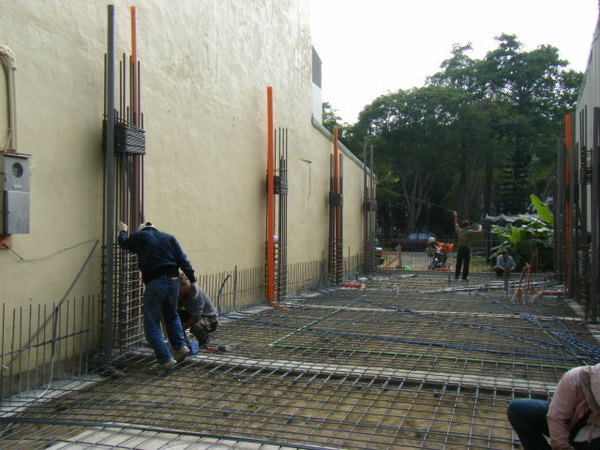 一切準備就緒,準備開始灌漿;有沒有注意到化糞池上面的鋼筋比較密集,由於在挖化糞池的時候挖到大約170cm的深度時就出水了,很難再往下挖深,導致化糞池埋的比較高,化糞池上面的混凝土厚度只有10-12公分,所以多補了些4分鋼筋作為補強。