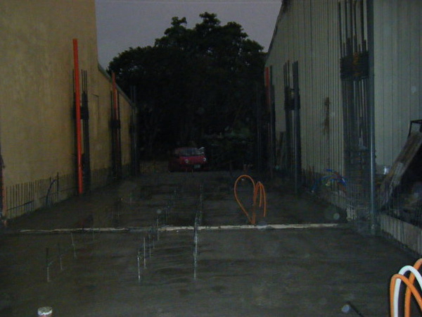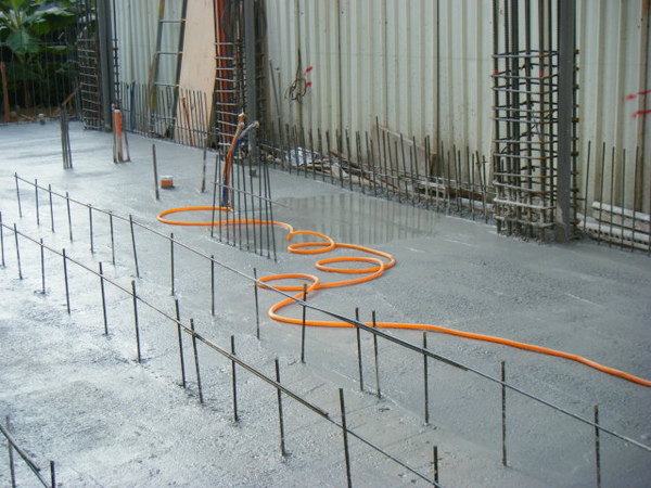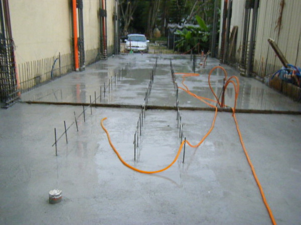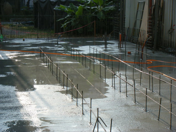接下來還要繼續澆水最少七天,同時進行一樓結構體作業,依序為模板放樣、昇柱鋼筋、組外牆模板、綁牆鋼筋、牆面水電配管、封牆內模、組樓板及樑模板、一樓頂版鋼筋綁紮、一樓頂板水電配管、一樓頂板灌漿等程序。