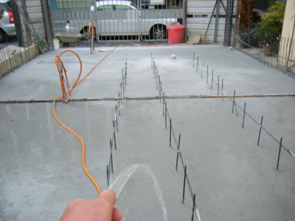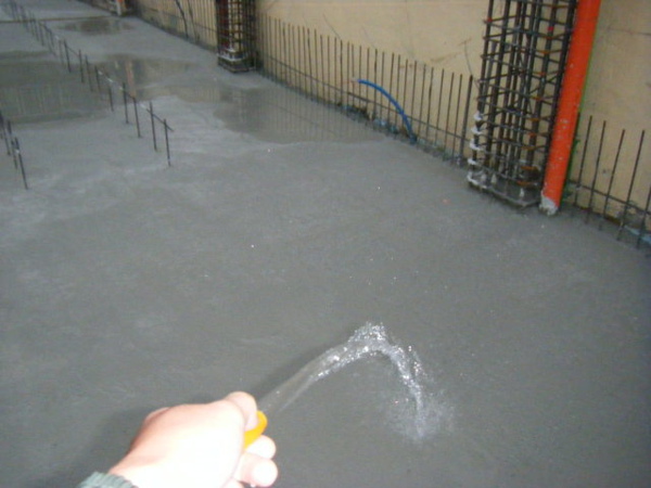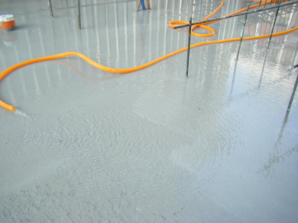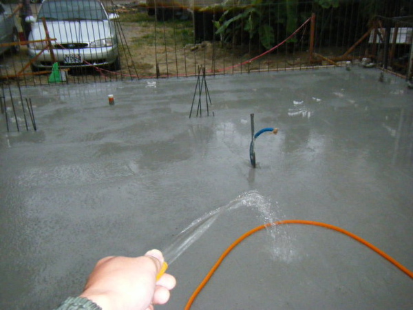 一般來說,在冬天的時候灌漿,大概灌漿完2個小時混凝土就會開始明顯變硬,此時就要開始補充水分;若採取灑水滯水的方式養護,需注意不可直接對著混凝土沖,太大的水柱會將混凝土表面原本用來「凝固」沙的水泥漿沖掉,以後地坪表面的沙子會因為缺乏水泥的凝結而脫落(俗稱「起沙」,台語發音),未來在貼地磚時容易產生磁磚脫落(俗稱「澎共」,台語發音),最好是水管平放在地上讓水慢慢流,淹滿所有要養護的範圍。