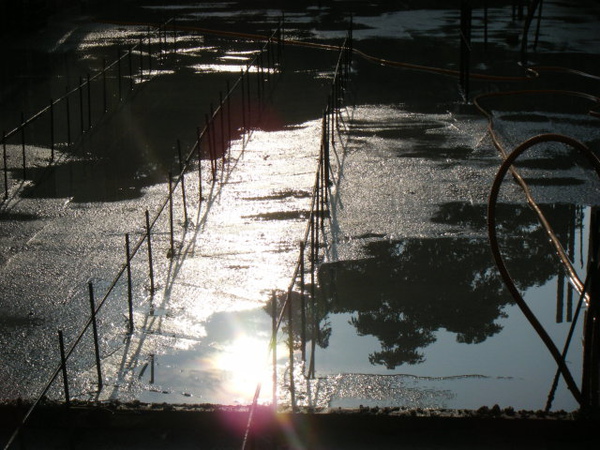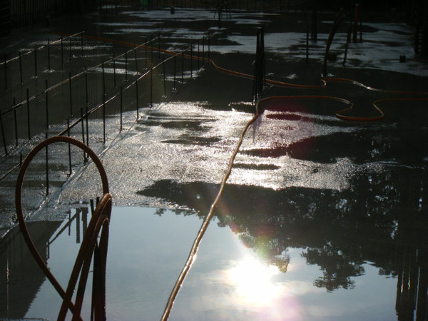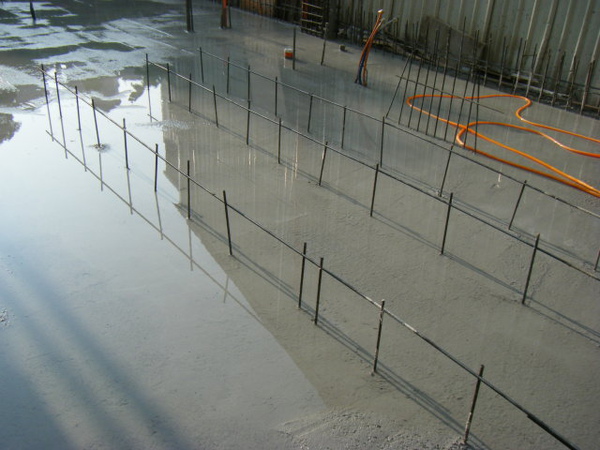 灑水滯水的養護方式,每天水分的補充最少要兩次,但是要避開中午太陽較大的時候,這時候比較熱水分蒸發較快,激烈的環境變化反而不利混凝土的水合作用。因此早上澆完水後,下午還要再來一次: