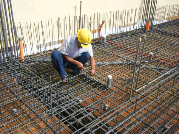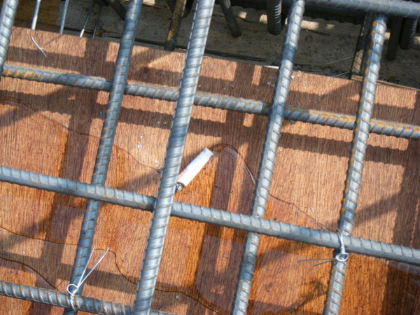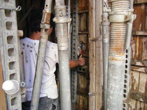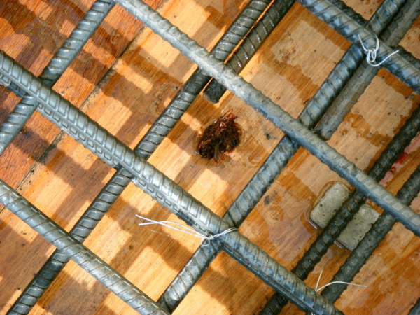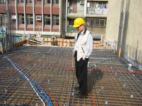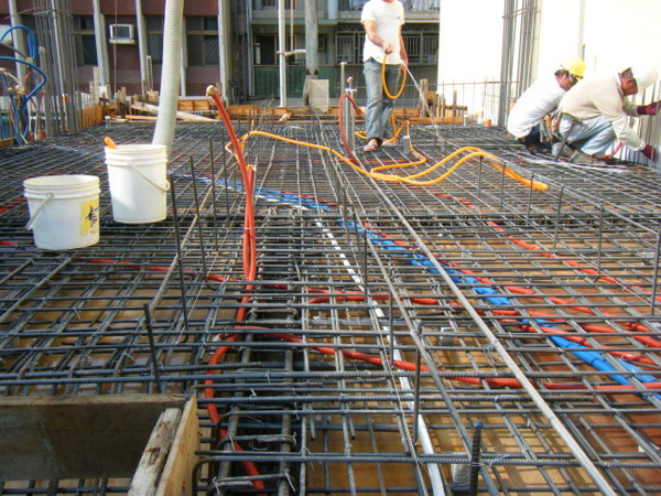 我還會安排多一個人在下面針對管路比較密集的部分用榔頭或是鐵棒敲打模板,務求混凝土灌漿後不要產生蜂窩現象: