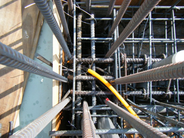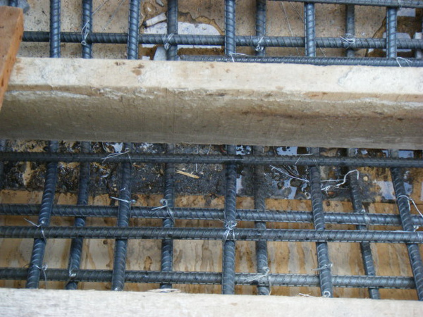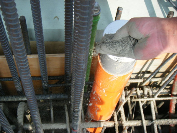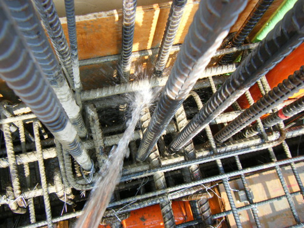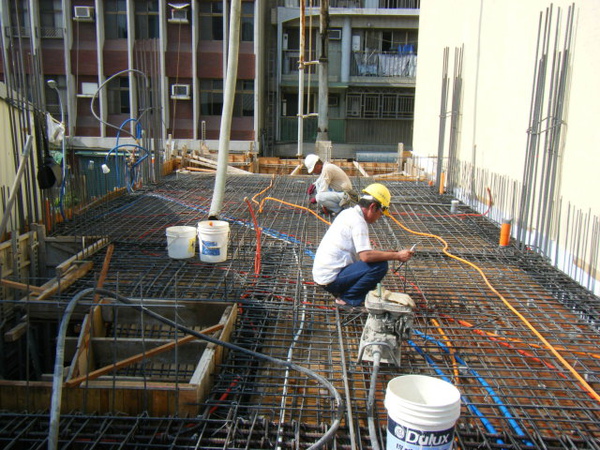 施工規範中是講說混凝土新舊交接處要灑上水泥漿以增加新舊混凝土的接著性,但是我們的經驗是若直接灑純水泥漿,水泥漿濺到鋼筋上面很快就會乾掉,反而減低鋼筋的握裹力,所以我們採取灑水泥粉的方式,然後再灑水將水泥粉從鋼筋上沖掉,在底部自然形成水泥漿;經實際經驗證明,這樣的效果會比直接灑水泥漿好。
