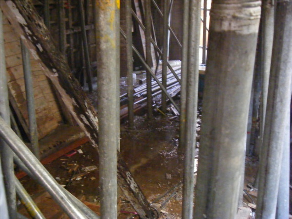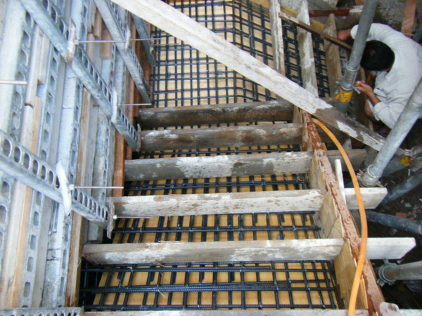 回歸正題。當該檢查的項目完成後(例如鋼筋綁紮、保護層、水電管路、預放之鋼筋等等),灌漿前最重要的事就是模板的清潔了,其中最難洗的就是樓梯(由於樓梯轉折的關係);看看樓梯尚未清潔前的模樣:
