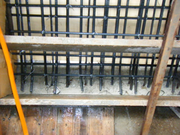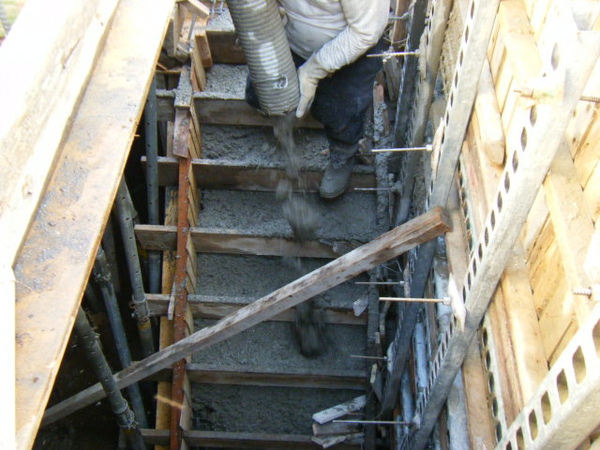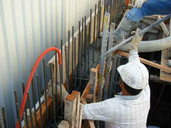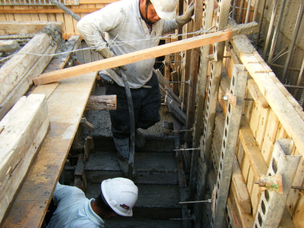 開始灌漿,一般若樓梯與牆面是同時澆灌的,會先將與樓梯相接的牆先灌到超過相接處的高度: