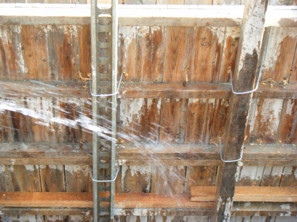 其實灌漿前清洗模板還有一個很重要的目的,就是將模板完全澆濕,避免乾燥的模板快速吸收混凝土的水分而產生裂縫,所以我除了清洗會與混凝土接處的內側模板外,還會從外面將模板徹底打濕,也兼具保濕性,有利於混凝土的養護。