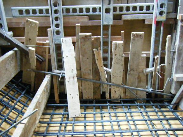 為什麼呢?為了讓樓梯與牆面交接處的混凝土先稍微凝固失去流動性,才能澆灌樓梯;通常師傅們會在樓梯與牆面的相接處插入密集的木板,避免牆壁裡面的水泥漿流出:
