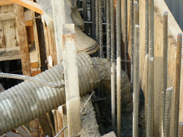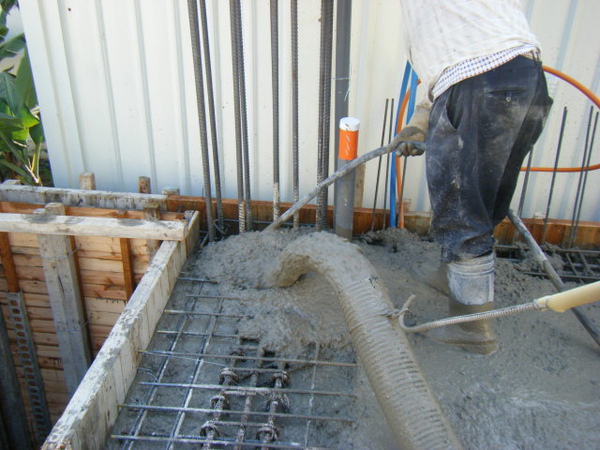 通常只要15分鐘左右牆壁內的混凝土就會失去大部分的流動性,此時就可以開始進行樓梯的灌漿;樓梯的灌漿比較不一樣的是要跟混凝土廠吩咐灌樓梯的料塌度調小一點;可以看到照面中的混凝土是一陀一陀的噴出來,而不是用流的: