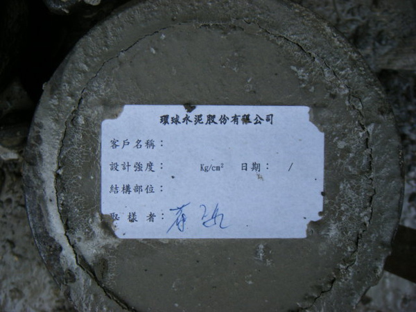 混凝土試體,裡面有放我難以模仿的簽名。這個作法是以前有不肖廠商現場的試體經測試強度不足,就用自己另外做的試體魚目混珠,後來就有業主想到放入自己的名片避免被掉包。於是環球這種自我要求高的一級大廠為了讓業主放心,也為了自己的商譽,就乾脆主動叫採樣人員拿小紙條給現場監工或業主簽名,然後放入試體中。
