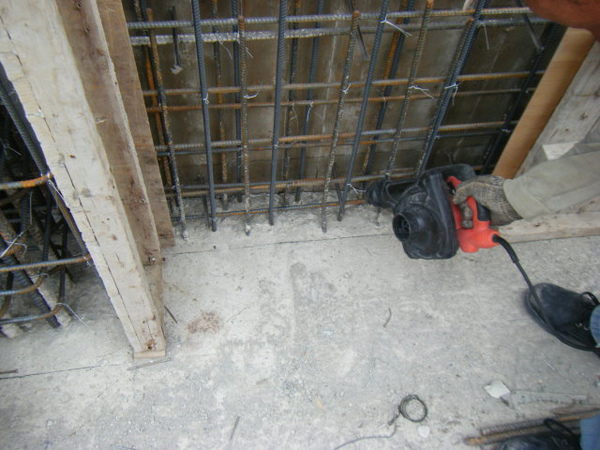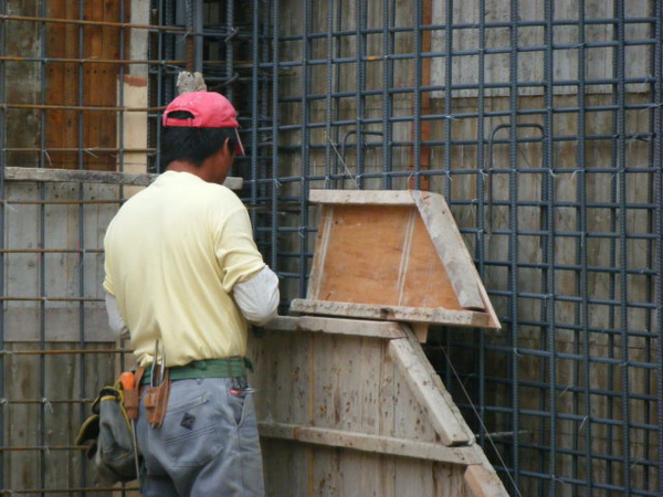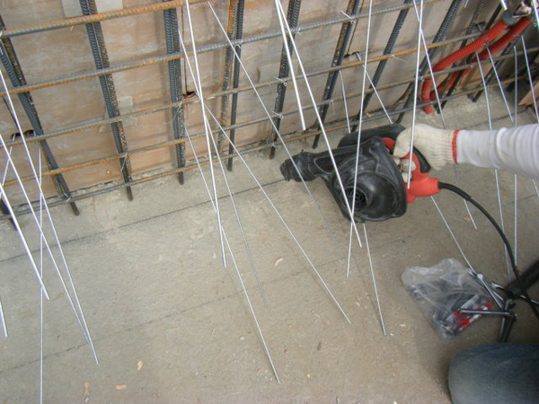 在釘好的內外模上鑽洞。