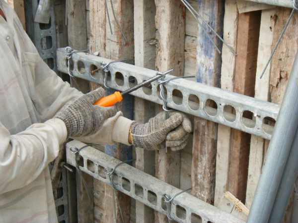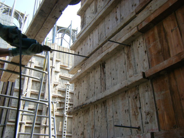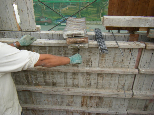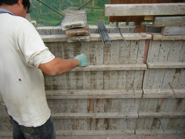 再將螺絲條或鐵線穿過剛鑽的洞來固定內外模板。