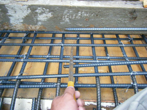 除了樓板上的混凝土工班以震動器擣實外,底下也要配置專人以榔頭敲打模板,其目的為確認混凝土是否飽實,如果沒有,就要告知混凝土工班再用震動器擣實之。