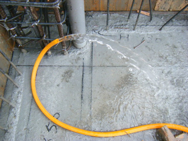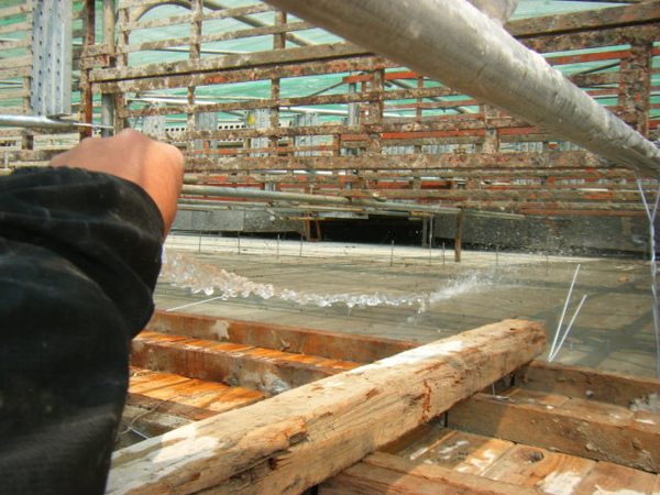 由於年關將近,幾乎所有工地都在趕工,原本昨天外模組立完成後,今天應該緊接著進行屋突牆壁及女兒牆的鋼筋綁匝,但是呢,鋼筋工班生意做很大,今天實在調不出人手,拜託我們讓他慢一天再來;對我們來說,反正過年前完成最後一層屋突灌漿即可,時間上尚稱充裕,就不擋人財路啦,讓鋼筋老闆外面發財去,我們剛好趁今天好好的澆水養護一天,進行四樓頂板灌漿後第三天的養護。